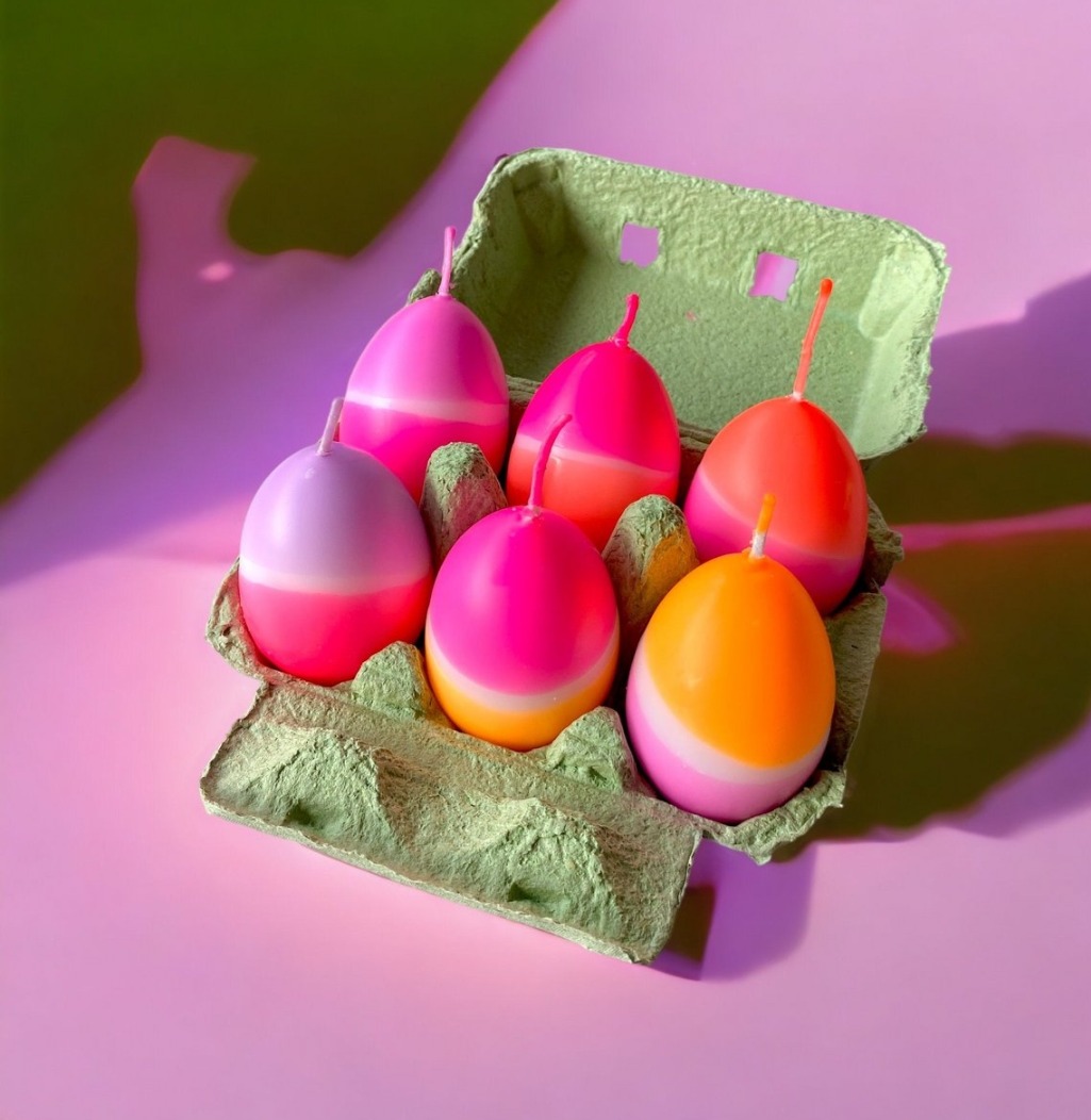 Breng kleur en sfeer in huis met deze set van 6 handgekleurde eierkaarsen in neon-look. Geleverd in een eierdoos met neon zeefdrukband. Perfect voor elke gelegenheid!